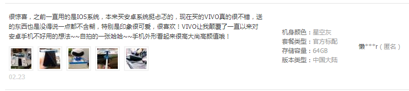 我刻意是提取了两根较为有象征性的点评来展现,这两根点评能够 看得出,选购vivo X9的客户都不谋而合的觉得vivo X9的自拍照和音乐是非常优异的,并且这两个产品卖点也正更是vivo主推的产品卖点—歌曲和自拍照。不难看出,vivo针对市场的需求的前瞻性還是很有迎合度的,可以那么有前瞻性,想来早期也是做了许多 材料搜集去掌握当下年轻人们的消费观念与要求的。楼顶两根评价来自于京东商城的客户